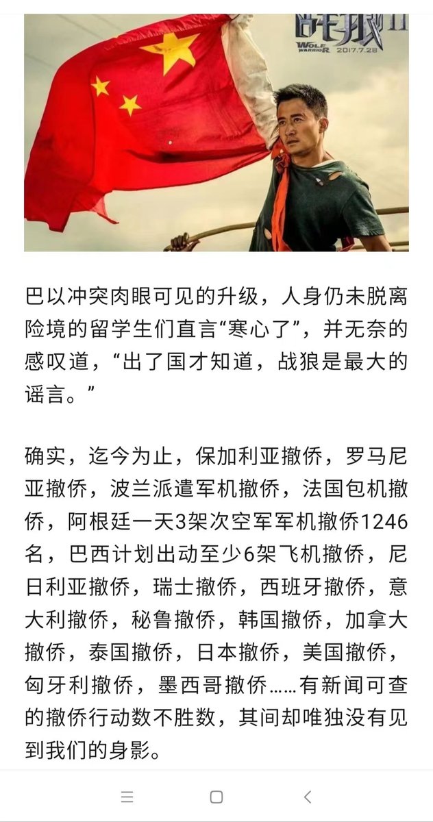 巴以冲突升级,在以留学生们直言“寒心了”,并无奈感叹:【“出了国才知道,战狼是最大的谣言”】......有新闻可查的撤侨行动数不胜数,其间却唯独没有见到我们的身影。