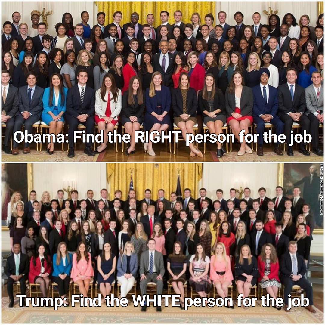 我与川粉打交道的经验是,总是吧“种族”问题放在首位。任何人做总统,政策都有好有坏,也可以说,对你有利有弊。但要找出他的倾向性,能预测他的未来。请看两张照片,你自己可以得出结论。川普时期白宫实习生的集体照公开指责川普性侵的26位女性打工人家不要这样的人,性侵都不找你这样的人。
