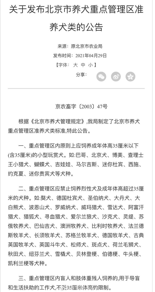 北京03年就出台了《养犬管理规定》,城八区只能养肩高低于35厘米的狗,还要办证。第一年1000,往后每年500。20年了。你们猜有执行吗?这两年陆续出台了不牵绳、不打狂犬就要罚款的规定。但狗证归公安管,防疫归属农业农村部管。曾有朋友拴着绳的狗被没绳的大狗咬了。公安大手一挥:人家有证!
