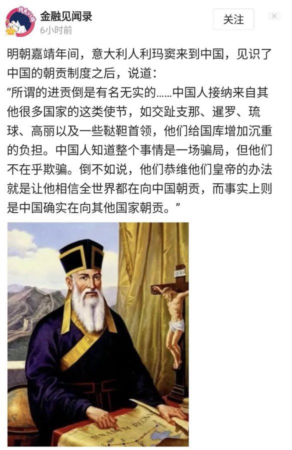 许多人以为朝贡是其他国家给中国钱,其实是中国给其他国家钱财,百倍抵偿各国敬献土特产,用大撒币换吹捧才是老祖宗传统。赔本赚吆喝本质上不关乎权力和实际利益,只关乎虚荣。