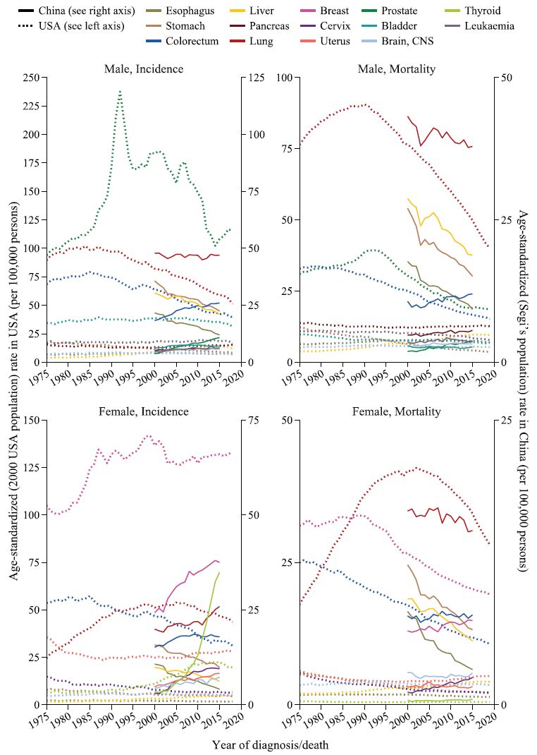 在男性中,美国肺癌和结直肠癌,以及中国胃癌、肝癌和食管癌的发病率和死亡率近年来逐渐下降。然而,美国的肝癌、中国的结直肠癌和前列腺癌的发病率显着增加。