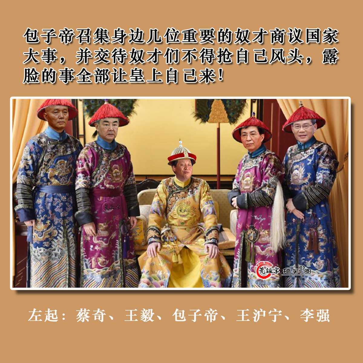 包子帝是个志大才疏,贪恋权力,脸皮奇厚,特别爱显摆的人!二十大取得绝对权力后,已经是一人之天下,每天都是在唱独角戏,各种秀愚蠢和下限!近日,包子帝召集身边几位重要的奴才商议国家大事,并交代奴才们不得抢自己风头,露脸的事全部让包子帝自己来!