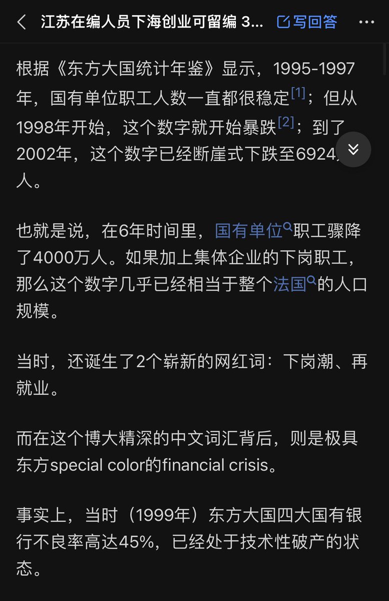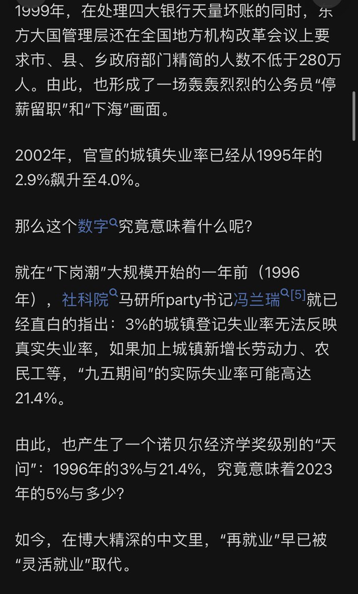 时隔24年停薪留职和“下海”再一次成为每个家庭餐桌上讨论的话题24年前,下岗了4000万人,相当于整个法国的人口当时,官方失业率为3%,实际失业率被社科院马克思主义研究所书记计算为21.4%现在,官方失业率为5%,实际失业率为??按照比例原则;中国现在的实际失业率(含灵活就业)至少为40%…