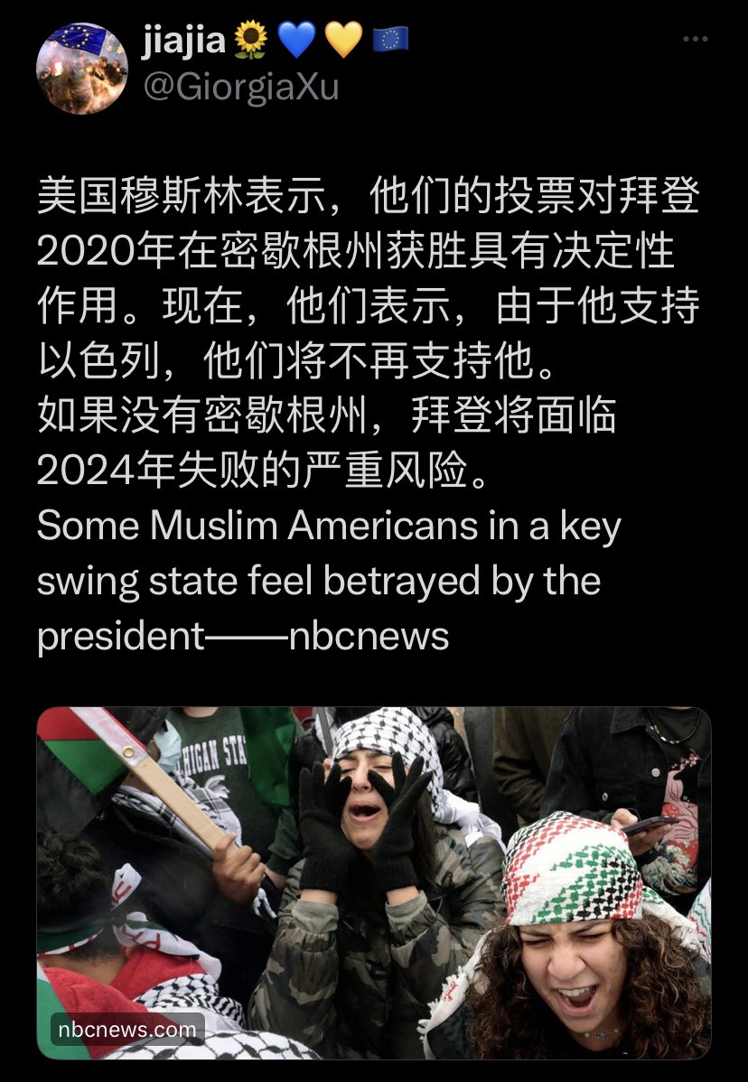 马聚的老婆威胁拜登,说他支持以色列就好失去密西根的选举。那么,如果拜登背叛以色列支持巴勒斯坦,拜登可能会赢得密西根的选票,但是会输掉其它各州的选票,根本无缘总统。穆斯林的智商是不是有问题啊,只觉得自己是关键作用,别人都要围着你们转?还冒出来威胁美国总统来了。十足的傻逼一个。
