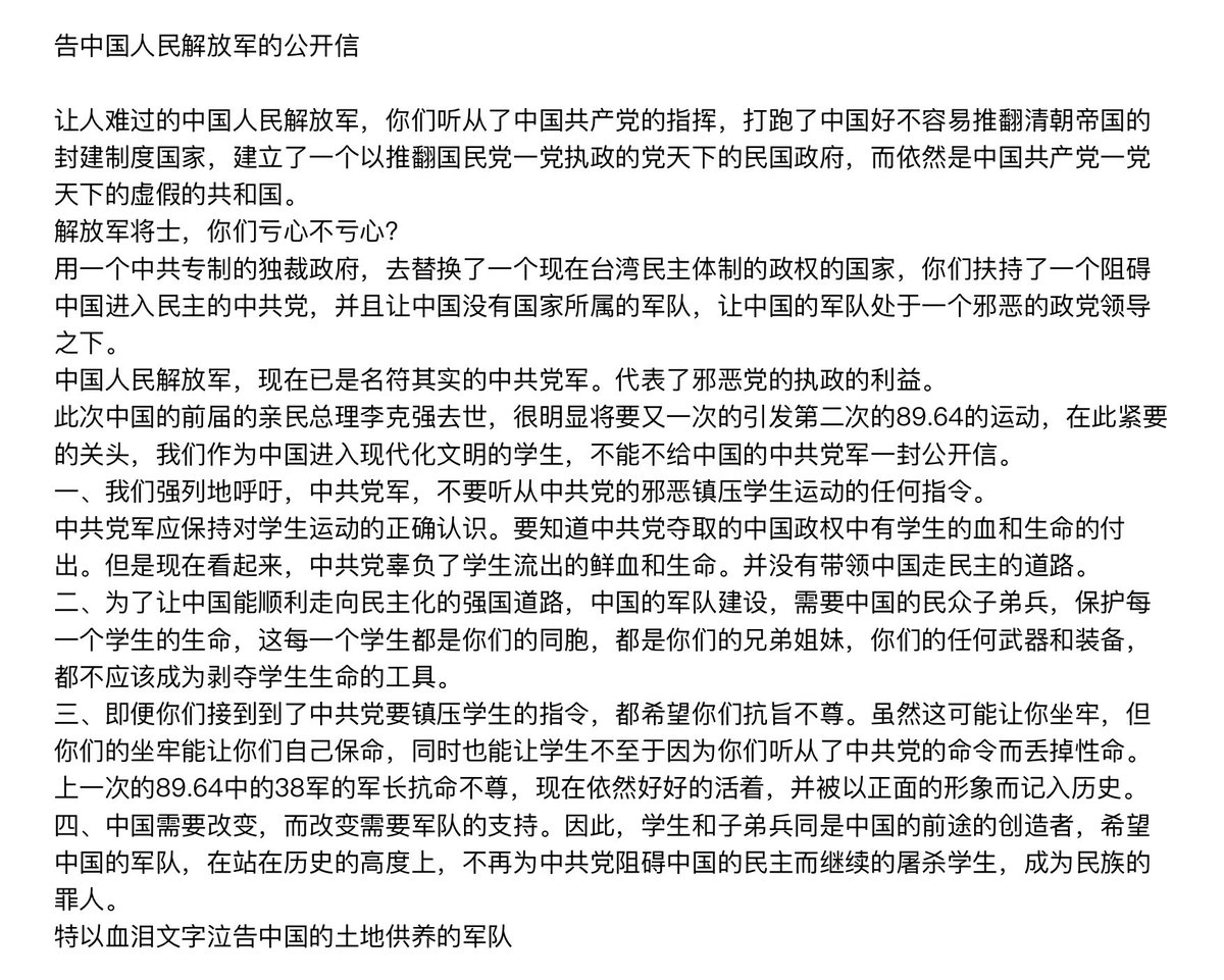 告中国人民解放军的公开信让人难过的中国人民解放军,你们听从了中国共产党的指挥,打跑了中国好不容易推翻清朝帝国的封建制度国家,建立了一个以推翻国民党一党执政的党天下的民国政府,而依然是中国共产党一党天下的虚假的共和国。解放军将士,你们亏心不亏心?用一个中共专制的独裁政府,