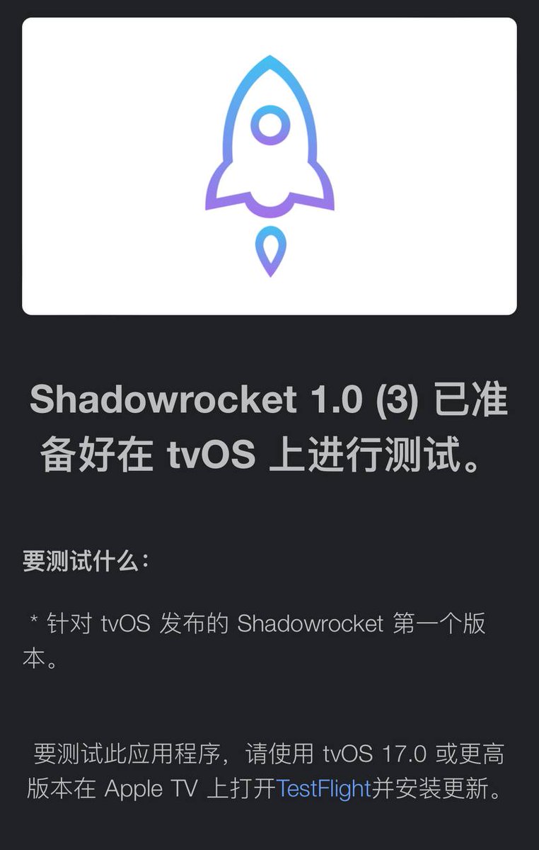 Shadowrocket 1.0 (3) 已准备好在 tvOS 上进行测试。