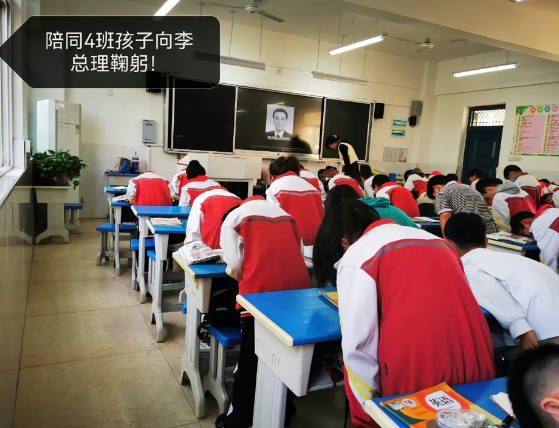 合肥一中学老师,带领三个班的学生向李克强遗像三鞠躬和默哀,表达哀悼。