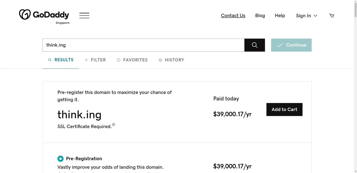 .ing 域名开始预售了,目前是抢注期间,价格比较贵。Godaddy 上面, 是3.9万美元(图一), 和 都是13万美元(图二)。普通的 .ing 域名的价格会每日下降,直到12月5日,该域名正式启用,对所有人开放,价格恢复正常。