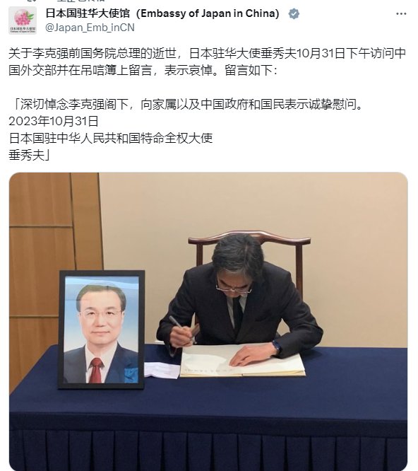 日本大使馆,在推特和微博,都发表了祭奠李克强的内容
