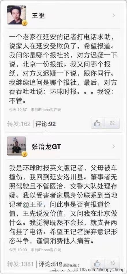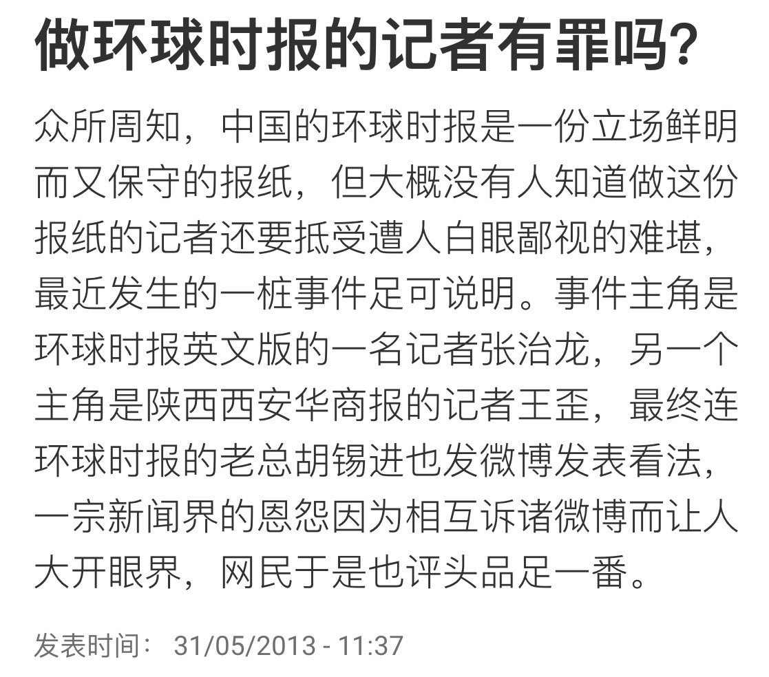 2013年旧闻:《环球时报》记者张治龙的家人在老家受人欺负了,没有享受到特权照顾,就跟同行爆料求助,结果反遭到同行鄙视。这时候,《环球时报》记者竟要求同行摒弃意识形态斗争、谨慎消费他人痛苦。依附中国官媒和政府的人,很多都有种盲目的优越感,但一旦遭到现实暴击,就知道自己原来也是蝼蚁。