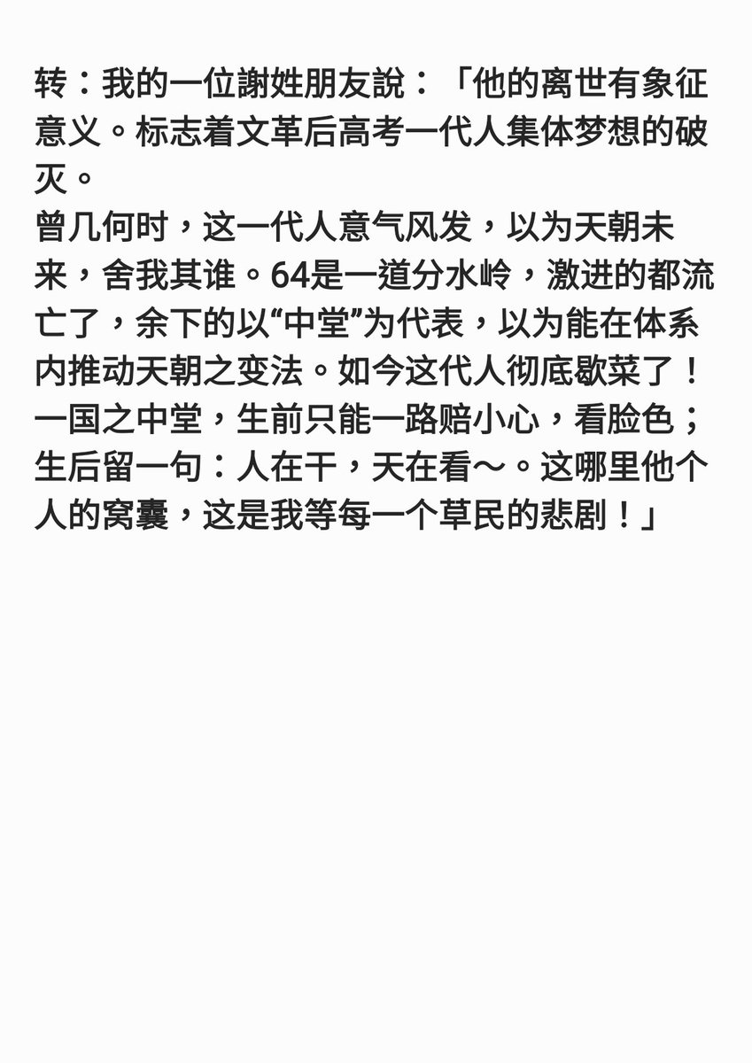 重新洗牌,从科举制回归门阀制……【转:我的一位謝姓朋友說:「他的离世有象征意义。标志着文革后高考一代人集体梦想的破灭】