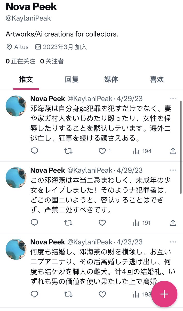 中共的国安部门经常会针对我这类的人,在网上以不同的账户大面积散播一些谣言,比如什么黑警,诈骗、刑讯逼供、迫害民主人士、组织卖淫等等荒诞不经的内容,甚至连我的妻子孩子他们也不放过,把身份信息以多国语言公布,附带造谣。这类低级谣言总有人信,甚至不乏大V来求证。我就不解释了,因为说多了…