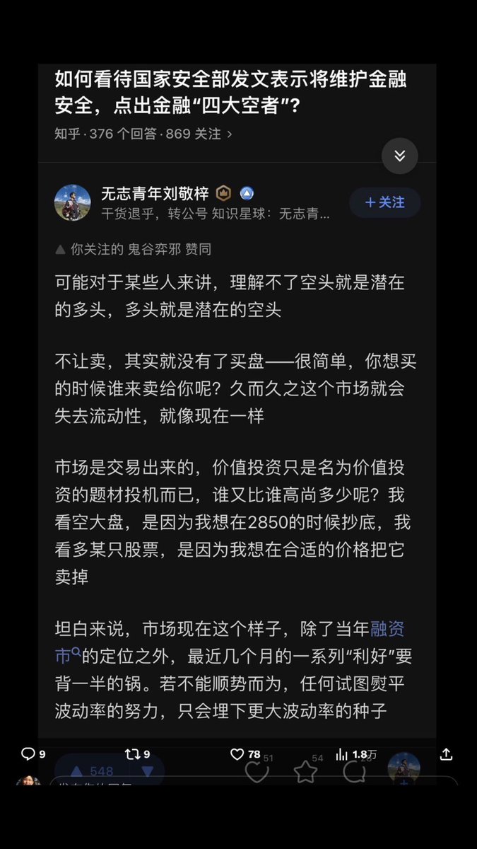2015年7月公安部副部长带着警察进上交所,核查取证“恶意做空者”。刀把子撑股市这出戏八年前就唱过了,可惜至今股市还在3000点上下徘徊。八年前全世界就见识了墙国刀把子顶着人脑袋唱多股市的荒谬一幕。现在抓境外势力反间谍,或许能把股市吓成僵尸市。这做法叫土匪治金融,权力秩序乱套。国将不国?