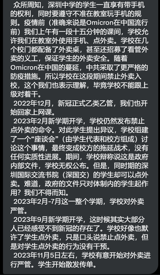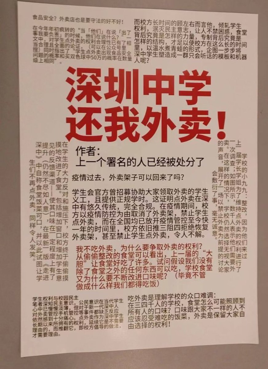 11月5日,深圳中学因为学校有意对学生点外卖行为进行严管学生开始在学校内散发抗议传单