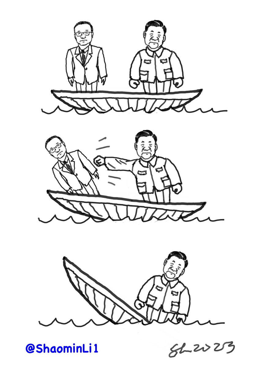 我忽然想到这么一幅漫画,马上画出来。I just had an idea about a cartoon and sketched it here:习:”你先下!“ Xi to Li: You go first!
