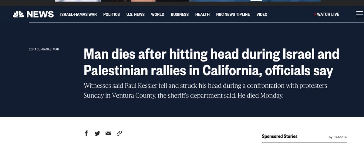 卧槽,无良媒体再创新低加州犹太老人被亲巴勒斯坦抗议者殴打倒地死亡这件事,NBCNews的标题是“男人(自己)撞到头部后死亡”,虽然正文里面验尸官已经确认了是他杀我理解Man dies after hitting head = Man dies after he hit head,这里的hitting是主动语态,暗指是他自己撞的头畜生假新闻啊
