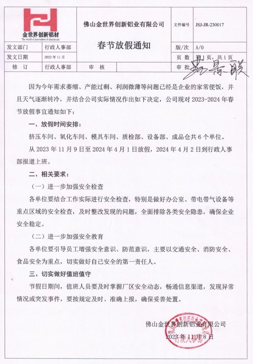 11月8日,佛山工厂宣布,因需求萎靡,产能过程,利润微薄等问题,直接从即日起放假5个月。