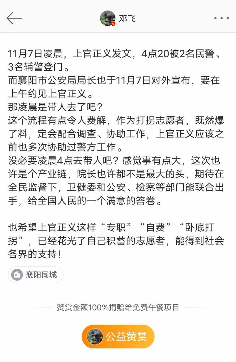 报道襄阳医院6万一张倒卖出生证(这种东西只有拐卖者才会买)的打拐志愿者上官正义,在11月7日凌晨四点20被五名警察上门带走。