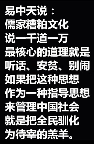 今天儒家思想依然传承在中国社会的每个角落,官方以儒家训练调教顺从民众,以法家打压控制反抗民众,以儒为里以法作表,非常完美的将14亿中国人,禁锢在儒家的道德教条围城之中,圈养在牺牲个体贡献集体的人性荒漠里,而理性,契约,商业,公民,信仰,博爱,普世,距离我们,依然是到天堂的距离…