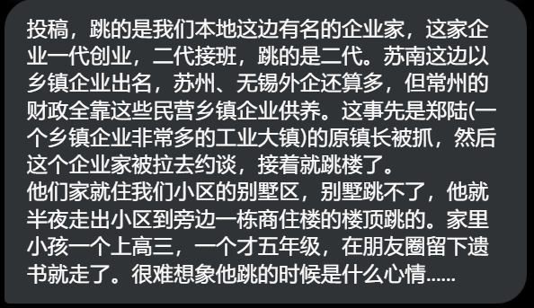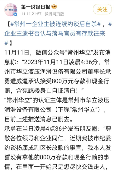 11月11日,“常州华立”发布消息称,其董事长承勇遭威逼承认涉及接受800万存款和现金行贿,含冤跳楼。在遗书中承勇表示,自己被市纪委约谈,涉及副区长放款事宜,一开始只想尽快交钱走人,没想到进退两难。在里面有点难熬,度日如年,所有证据都是猜想出的刚好对上的巧合,我不想受累了,拜拜!