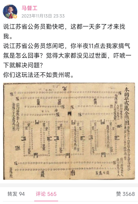 11月14日凌晨,B站up主马督工称,自己因为制作了一期视频《GDP≠退休金,关注江苏=关心自己》,导致江苏有关方面半夜去他家敲门。目前这则视频在B站还可以观看。
