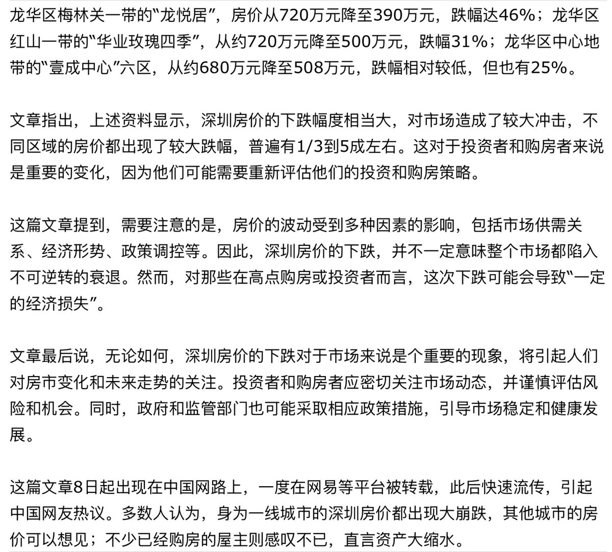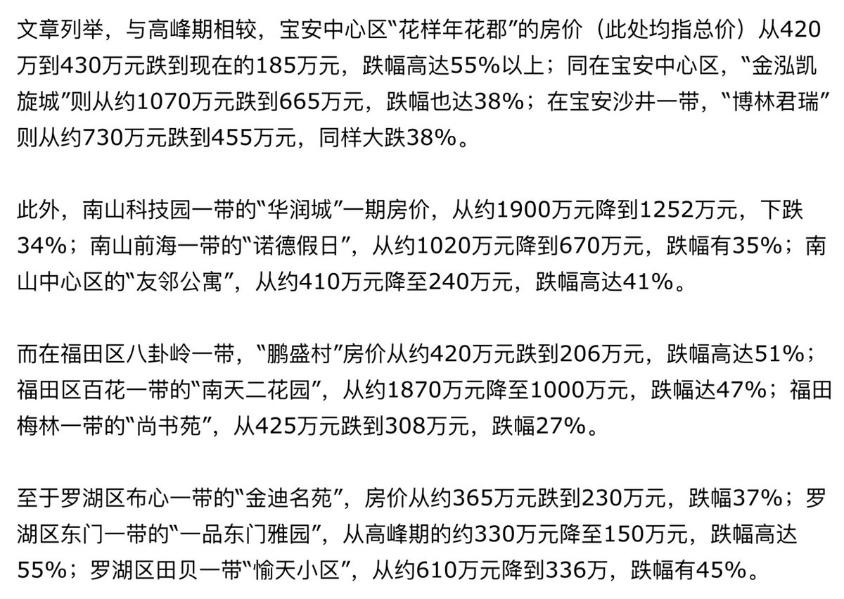 业内人士发文揭深圳房价暴跌55% 全网热传被秒删深圳房价出现腰斩的文章在网络引发风暴。该篇文章是由中国业界人士发表的,直指深圳房价出现“踩踏”式崩跌。其中,宝安区中心地带有商品房价从人民币420万至430万元跌到185万,暴跌逾55%,其他地区跌幅也多在40%上下,引起热议,但此文目前几乎被删除殆尽