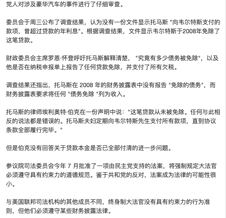 关于美国最高法院大法官托马斯腐败行为的一个总结性描述。