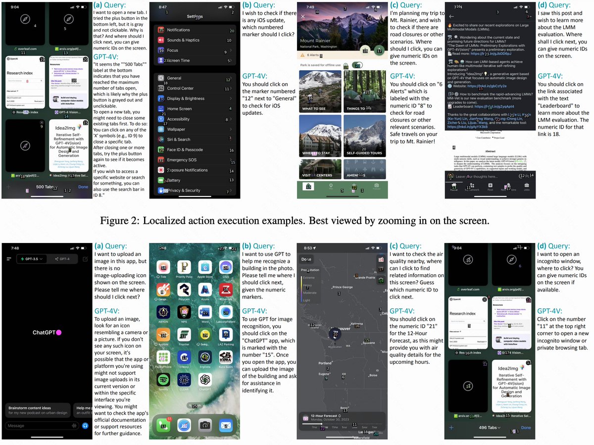 GPT-4V 作为一个多模态模型,接受视觉图像和文本作为输入。该研究引入了一种名为“标记集”提示的方法,以引导 GPT-4V 进行屏幕交互,其中屏幕上的 UI 元素被检测并标记有数字标签,供 GPT-4V 识别和交互。