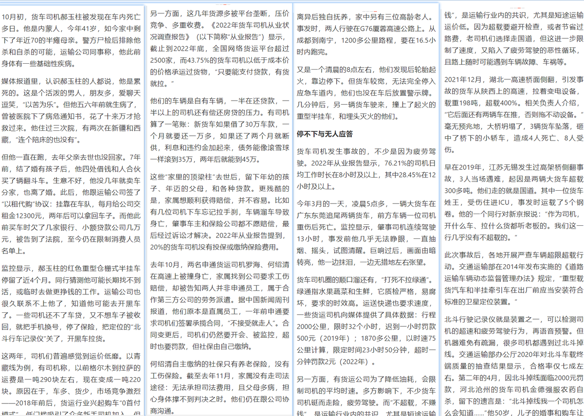 11月13日,一篇关于中国货车司机困境的文章在网上迅速引起热议。 根据报道,过去三年中,共有96名货车司机意外死亡,多数是因夜间驾驶造成的交通事故。这些司机通常是背负重债的中年男性,长时间工作,常面临疲劳驾驶的风险。 不仅如此,他们还面临职业病的威胁,长期驾驶导致的胃病、颈椎病和高血压使他们难以转行。 另外,工作环境的不确定性和极端情况也是常见问题。 网友感叹“中国什么都很方便,是建立在把人不当人的基础上”