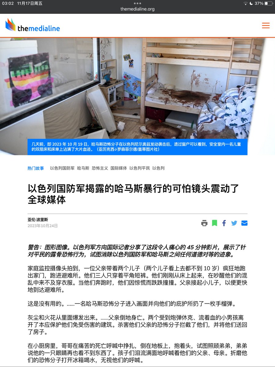 针对世界各地对以色列公开信息的质疑,以色列军方在10月23日邀请200余家国际媒体观看了有关视频音频等资料。布林肯等一些美欧政要也看了。随后一些媒体记者做了文字描述,我在推特上看到过,推友较真可帮忙搜一下吧。我这里太晚,要休息了。链接是一例
