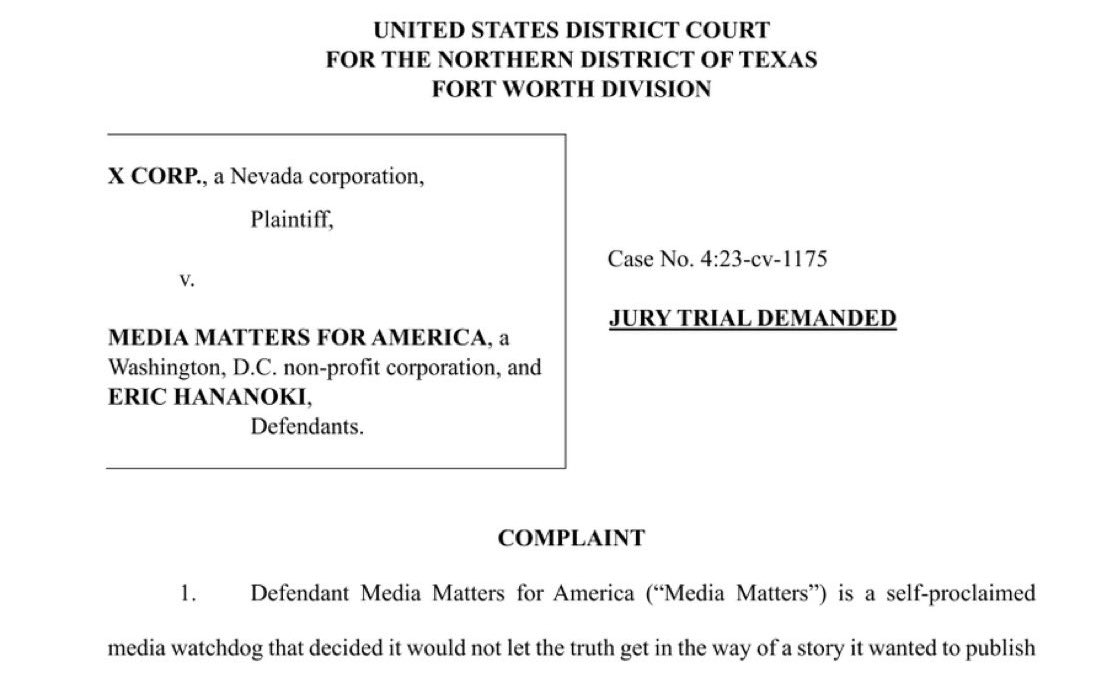 LAWSUIT SUMMARY: X Corp filed a defamation lawsuit against Media Matters for America and one of its writers, Eric Hananoki.