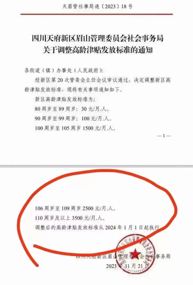 11月21日,四川天府新区发布了高龄津贴发放调整通知,其中80-89岁每月30元,90-99岁每月100月,100-105岁每月1500元,110岁以上每月3500元。