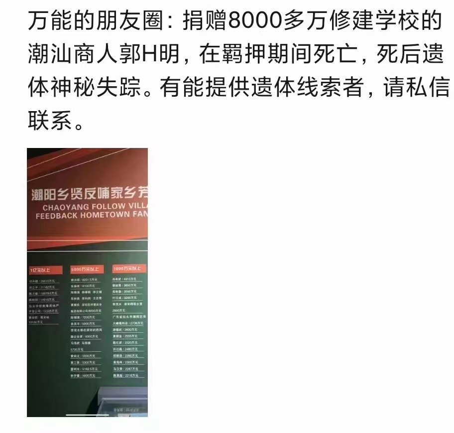 目前有限的信息表明。郭先生名叫郭H明,是潮汕人,亿万富翁。曾一次性捐助八千万元,建设学校。是一位大爱善举民间义士。