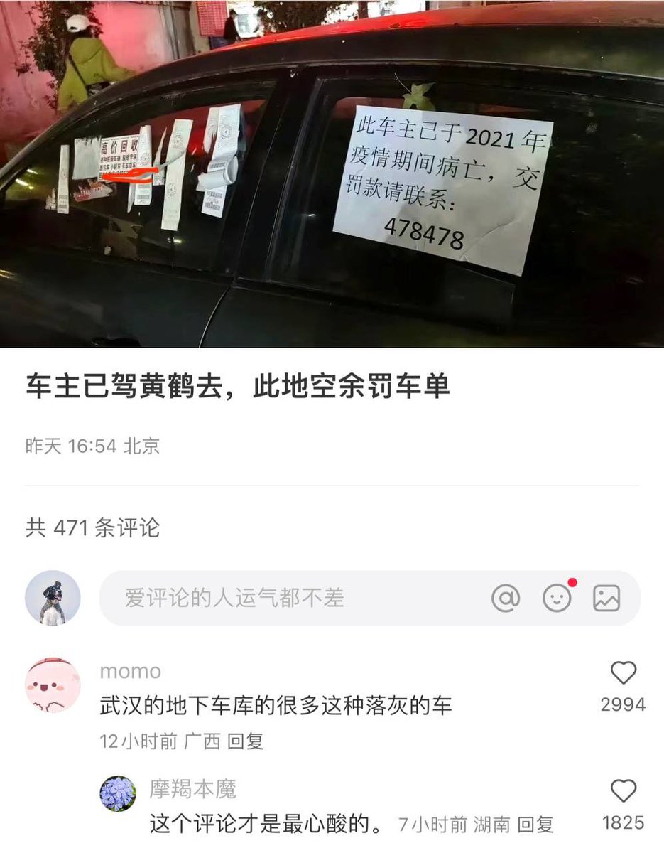 夕人已死因肺炎,催号罚款贴车边,车主已驾黄鹤去,此地空余罚款单!