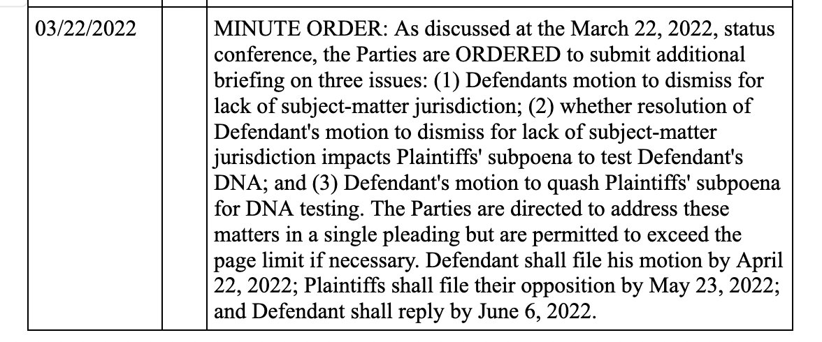 圖一是聯邦法官的其中一次簡短判決(Minute Order),即發生在魏京生將案子轉移到DC聯邦法院期間。2022年3月22日,「法院裁令:根據2022年3月22日的案情狀況會議的討論,有以下三個問題需要雙方當事人提交附加說明:(1) 被告魏的撤案動議;(2) 對被告魏撤案動議的裁決會否影響原告向被告發出的DNA檢測傳票;以及(3) 被告魏提出的取消原告DNA檢測傳票動議。... …」