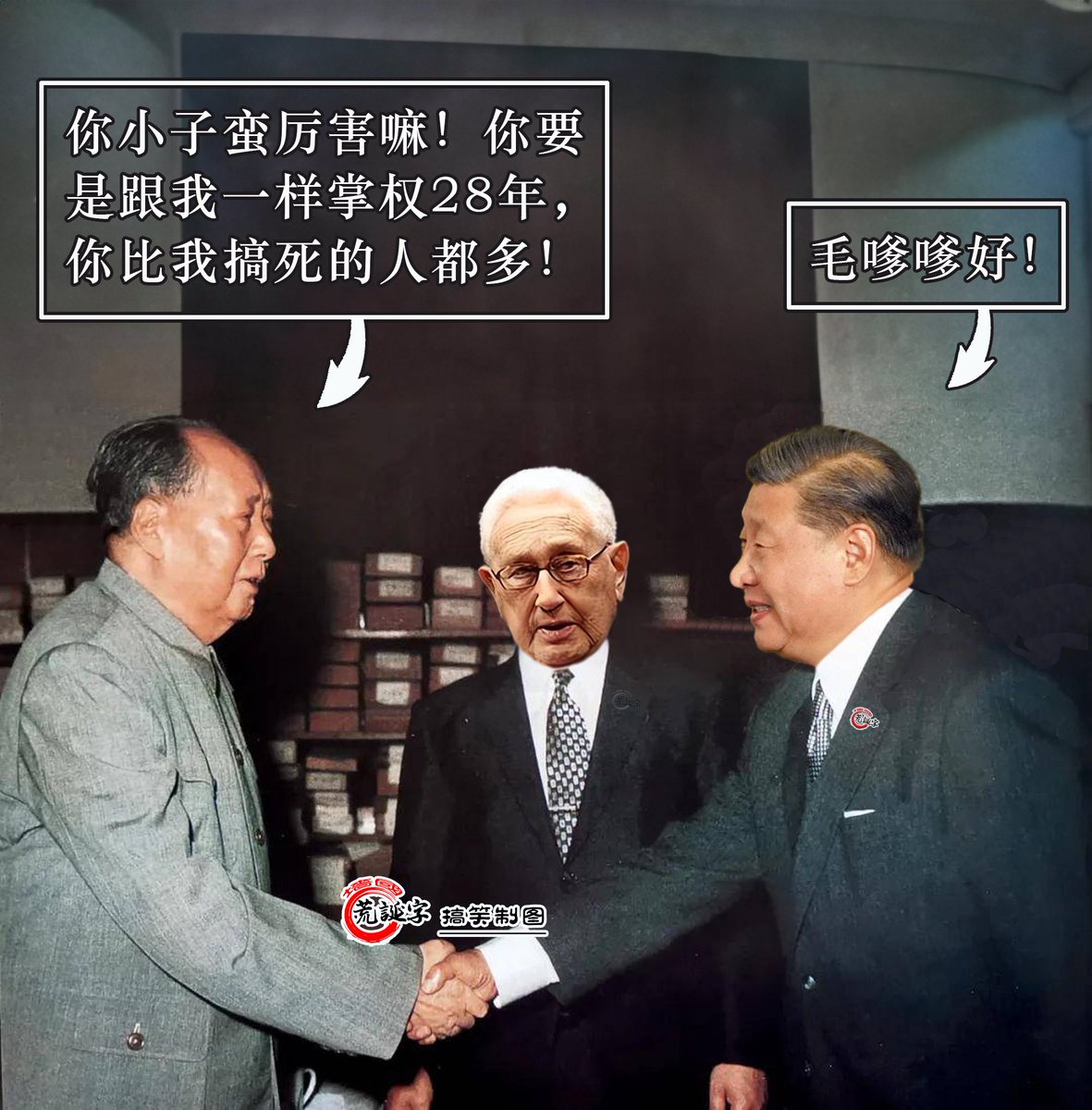 时隔47年,伟大领袖毛主席在老朋友基辛格博士的带领下,于昨夜重返中南海视察,并亲切会见了人民领袖习包子。老领袖对新领袖的工作给予了高度肯定,夸赞习包子是块好材料,并说地府那边更需要这样的鬼才,希望习包子尽快过去一起共图霸业,争取早日推翻阎罗王政权,率先在地府实现共产主义!