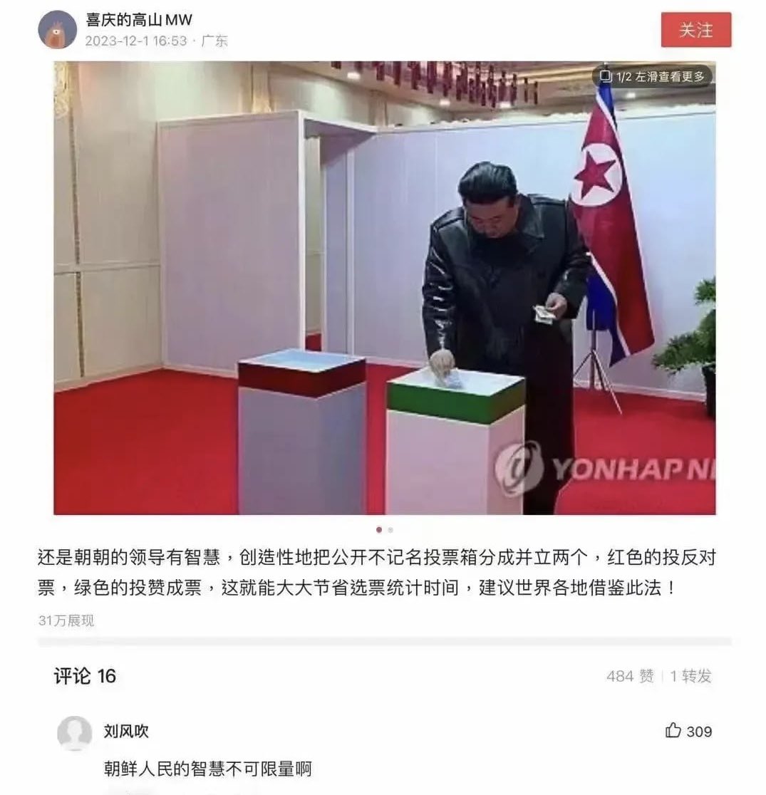“朝鲜的领导有智慧,创造性地把公开不记名投票箱分成并立两个,红色的投反对票,绿色的投赞成票,这就能大大节省选票统计时间,建议世界各地借鉴此法!”