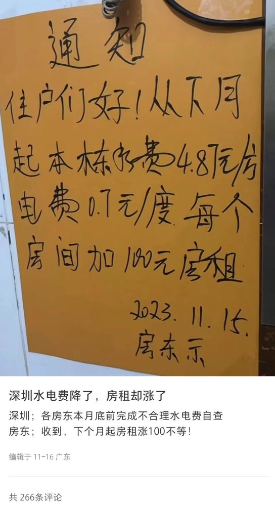 网友表示,深圳农民房的水电高价貌似形成了某种约定俗成的现象,实际上真实房租价格是房租+高出的那部份水电费。