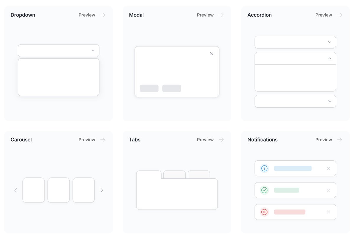 包括了日常所有常用的组件,比如 Dropdown,Modal 等等,样式是 Tailwind.css 写的,甚至还有 Headless 模式的组件,主打拷贝来就能用,不需要任何其他的依赖,所有逻辑都写在 html 中还是很神奇的,而且速度极快,一个下拉菜单拷贝一下就可以快速实现。不需要任何 build 过程,感受还是很神奇的。