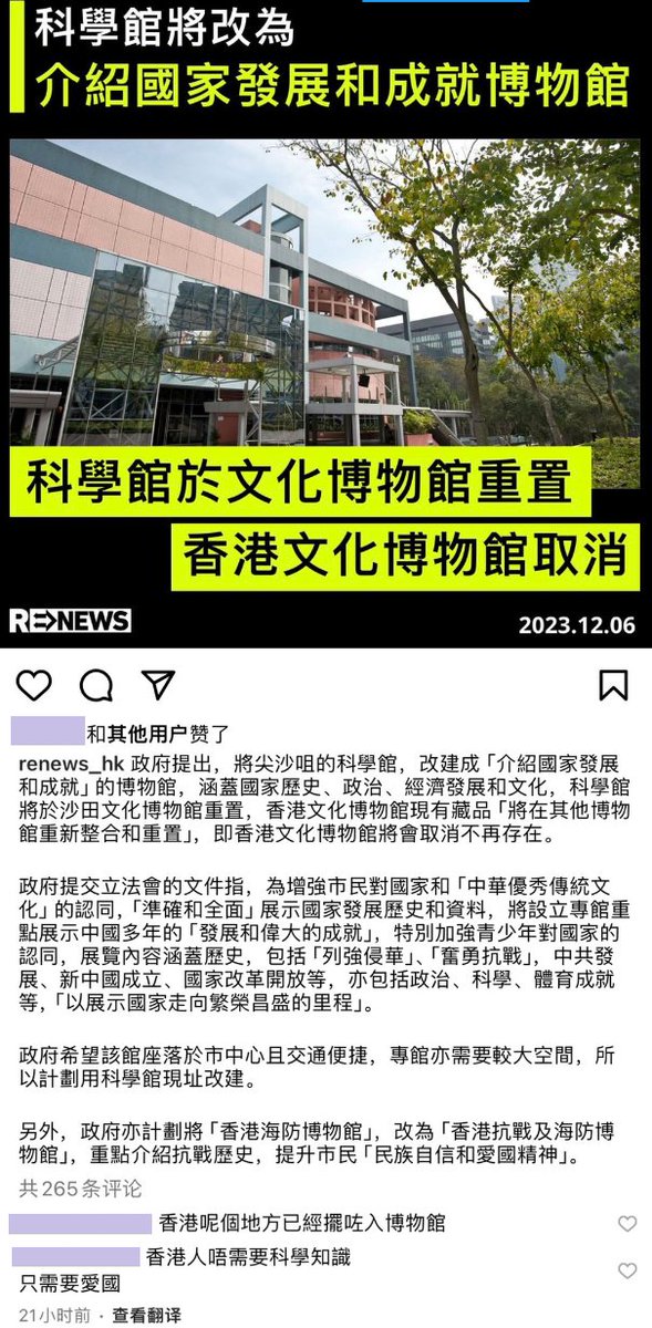 12月6日,香港文化体育旅游局向立法院提交文件,计划将香港科学馆改为“展现国家宏大发展和成就”的纪念馆,并搬迁至现在香港文化博物馆的位置
