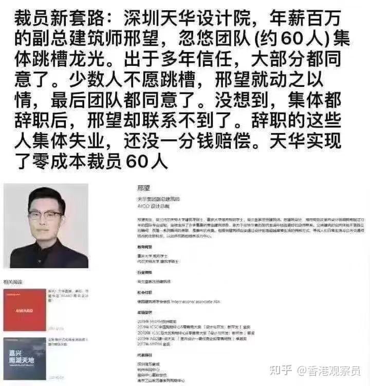 有网友爆料了深圳某公司,副总建筑师忽悠羡慕的员工集体跳槽,待到员工辞职之后,改建筑师却联系不到了。公司实现 0 成本裁掉 60 人。堪称世上最恶毒最恶心的裁员。