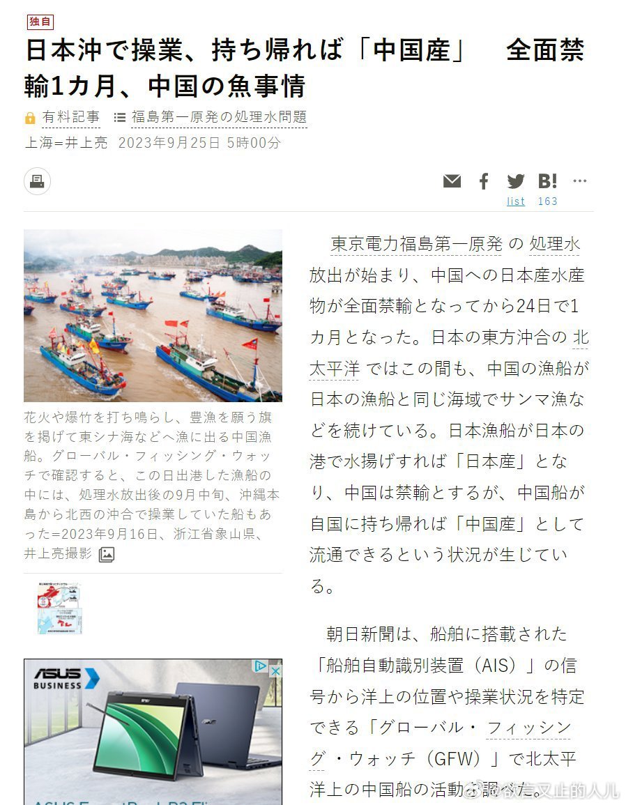 日本朝日新闻报道称:在核排放一个月之后,目前,每天约有150艘中国渔船在日本附近海域捕鱼。在同一片海域,日本渔船的鱼被禁运,而中国渔船的鱼则作为“国产海鲜”在国内流通。