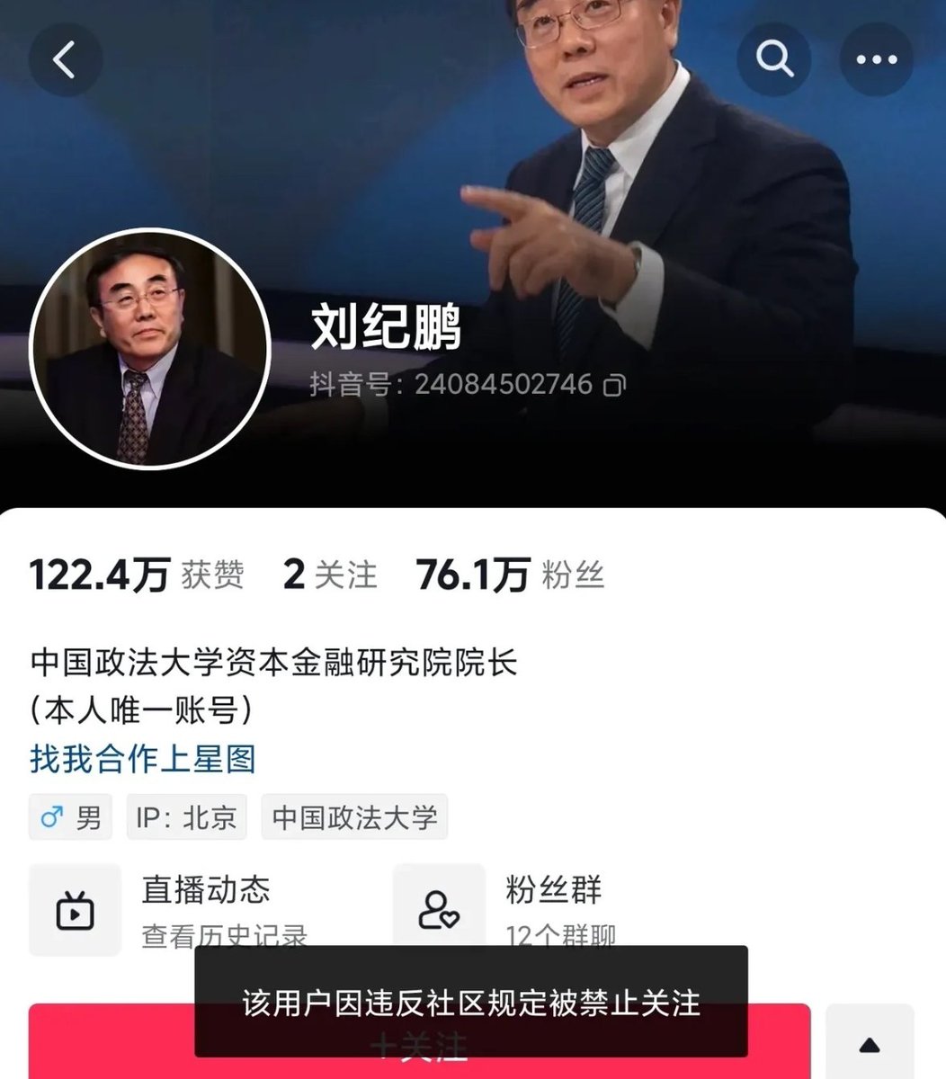 #观察 呼吁A股制度改革的刘纪鹏头条号被禁言,抖音号、微博被禁止关注。