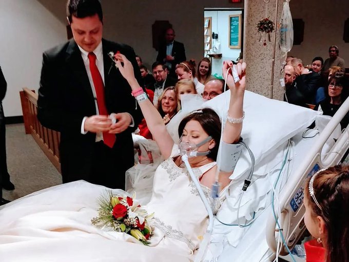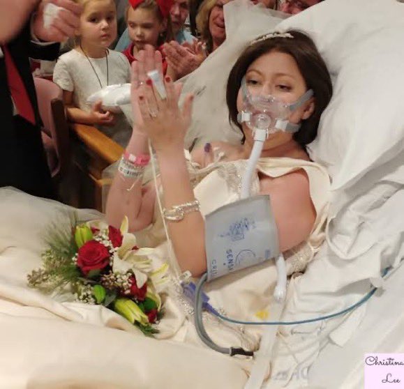2017 年 12 月 22 日,在哈特福德的圣弗朗西斯医院,希瑟·莫舍 (Heather Mosher) 身穿婚纱戴着氧气面罩躺在床上,和大卫·莫舍 (David Mosher) 举行了特别的婚礼。