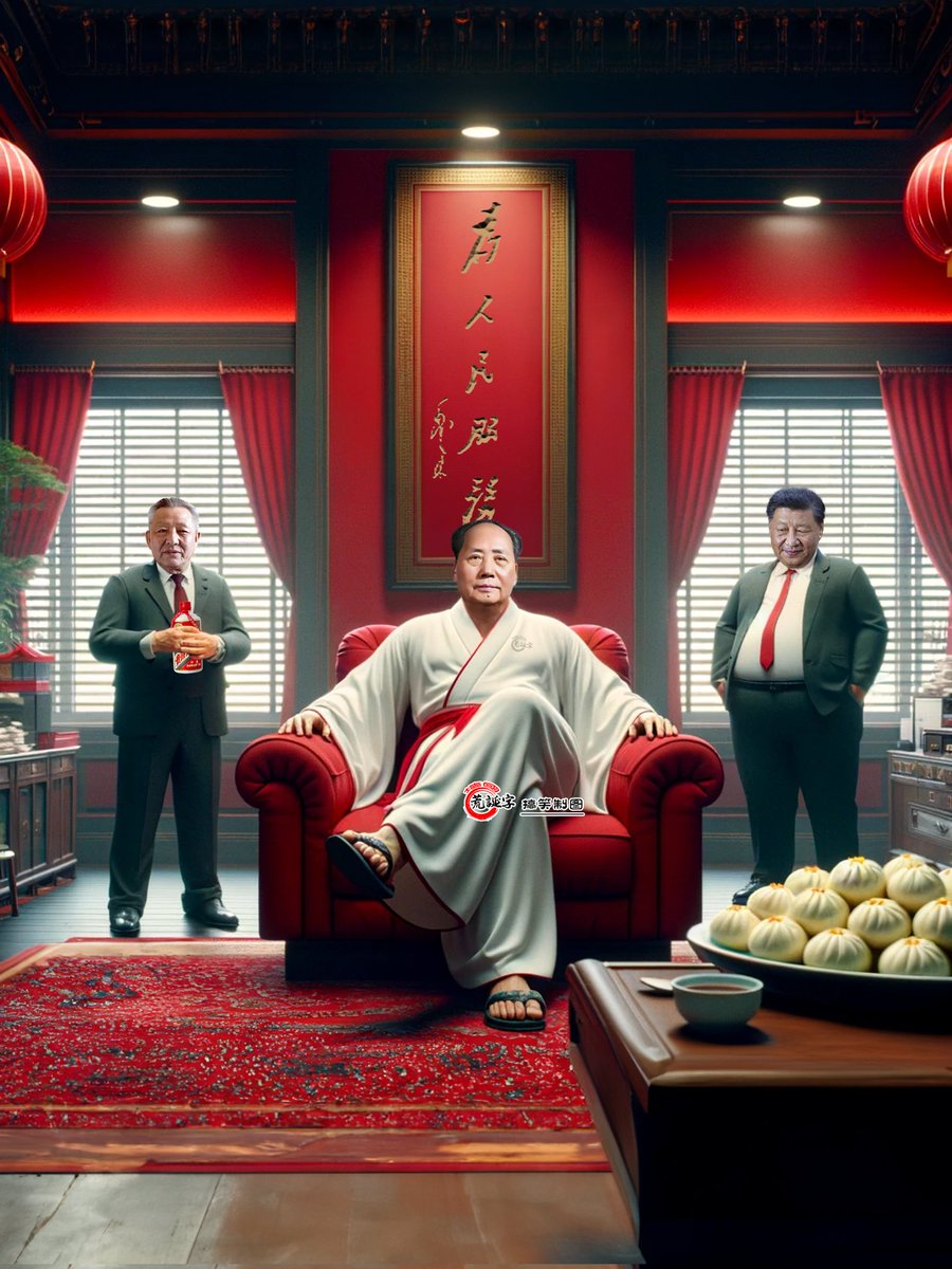 习包子父子俩带着礼物去拜见老毛。老习说:“老大!我和您干孙子来看您来了!”习包子忙说:“毛嗲嗲!您吃包子!”老毛生气道:“我不吃包子!我爱吃的是红烧猪肉!我也没你这个干孙子!你小子野心大的很呐!斗大的字不认识一筐,出的书比我的多出几十倍!我知道你随时想要搞掉我的……”