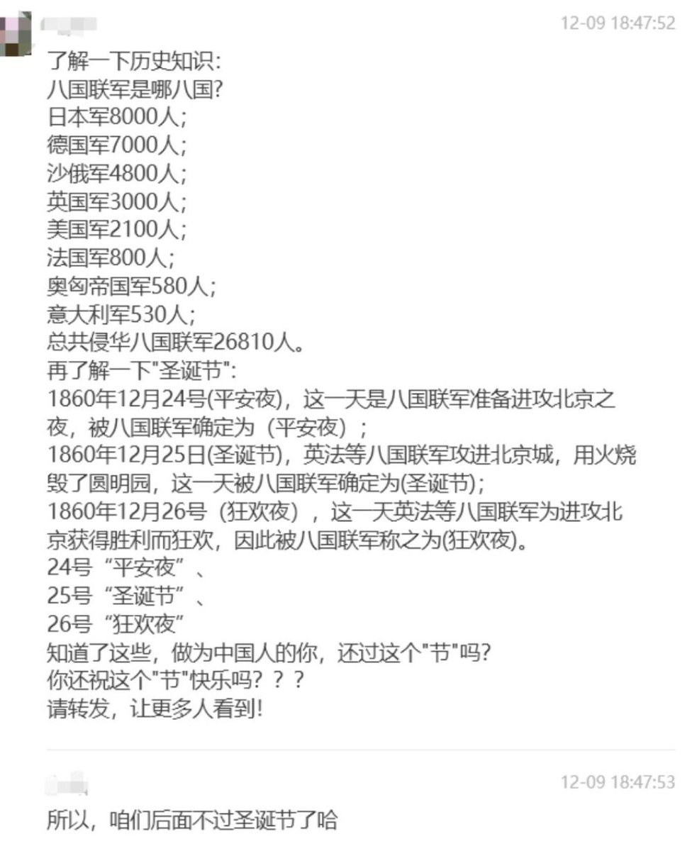 12月9日,上海某高校辅导员发文提醒学生不要过圣诞节,称“平安夜”“圣诞节”“狂欢夜”都是八国联军为了庆祝攻占北京而设立的。