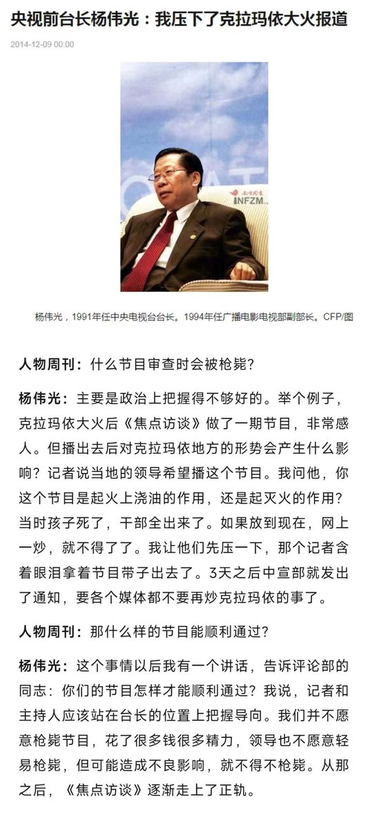 这位杨伟光和韦君宜笔下的那位纪检委员是同一个逻辑:韦君宜在《思痛录》里写到这样一件事:‘四人帮’垮台后,韦君宜以工作组成员的身份下到某县调查,发现有两起人命案,一个是被打死,一个是被逼自杀,一望而知是冤案。然而,当他们试图改正时却遇到想像不到的阻力。地委明知是冤案,但就是不肯改正。幸亏当年中央正在拨乱反正,平反冤假错案,这两个案子好歹有所‘纠正’,不过只是轻描淡写,根本谈不上伸张正义,而对制造冤案的县委彭书记也没有进行应有的惩罚。