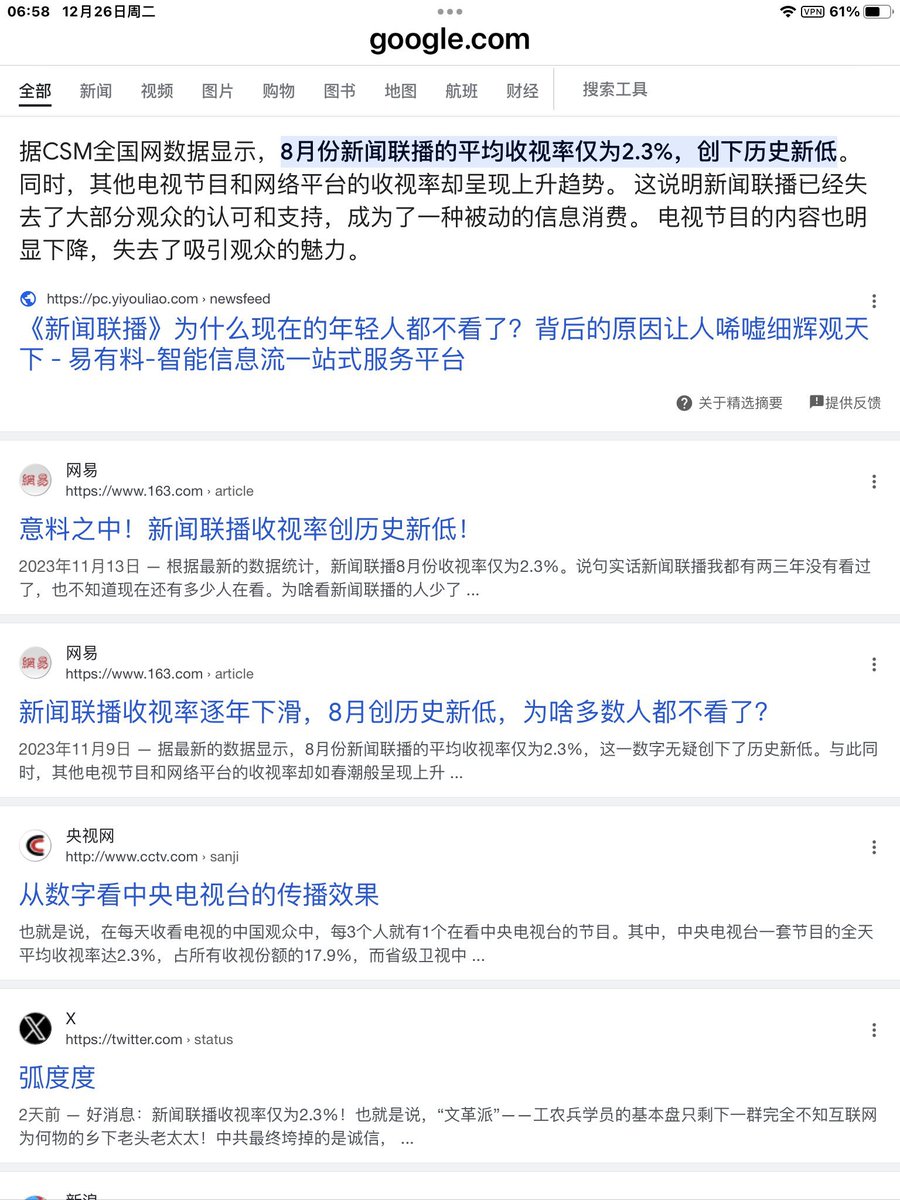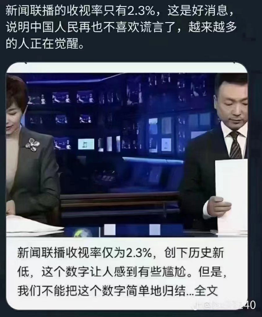 【新闻联播的收视率只有2.3%】这是好消息,说明中国人民再也不喜欢谎言了,越来越多的人正在觉醒。