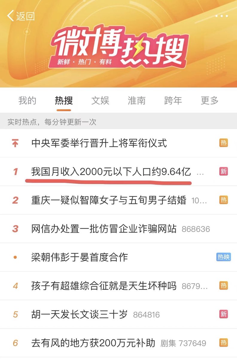 【中国月收入2000元以下人口约9.64亿】这条排名第一的微博热搜已被快速撤下。话题来自《第一财经周刊》刚发的文《李迅雷:上山容易下山难?从需求侧看经济》https://t.co/9Vz8ZSUND0 文中提及“根据北师大中国收入分配研究院2021年发表的调查数据,我国月收入2000元以下的人口约为9.64亿。”