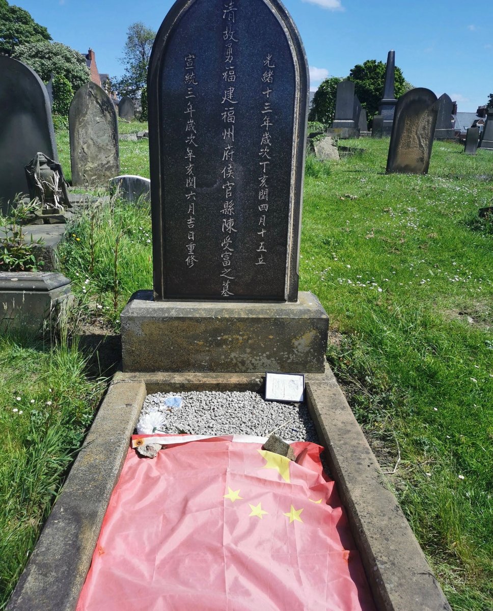很早就听说过英国埋葬着五名中国北洋水师官兵,正好我现在的小镇离官兵墓所在的Newcastle市不到60英里,就跟朋友驱车来了,只花了一个多小时就到了,在一个墓园里叫St. John Cemetery,这五名官兵去英国接收巡洋舰时不幸客死他乡,我们去的时候感觉近期已有同胞来祭拜过,还摆放了很多中国航母的照片❤